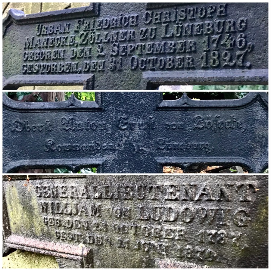 Und es finden sich ganz alte gusseiserne Kreuze aus dem 18.Jahrhundert, so für Urban Friedrich Christoph Manecke, ein Zöllner und Verfasser einer großartigen Stadtgeschichte, oder für den Lüneburg-Kommandanten Oberst Anton-Ernst von Lösecke oder Generalleutnant Willjam von Ludowig, der an der Friedhofsmauer lehnt: Napoleon hat aufsteigen und untergehen sehen.