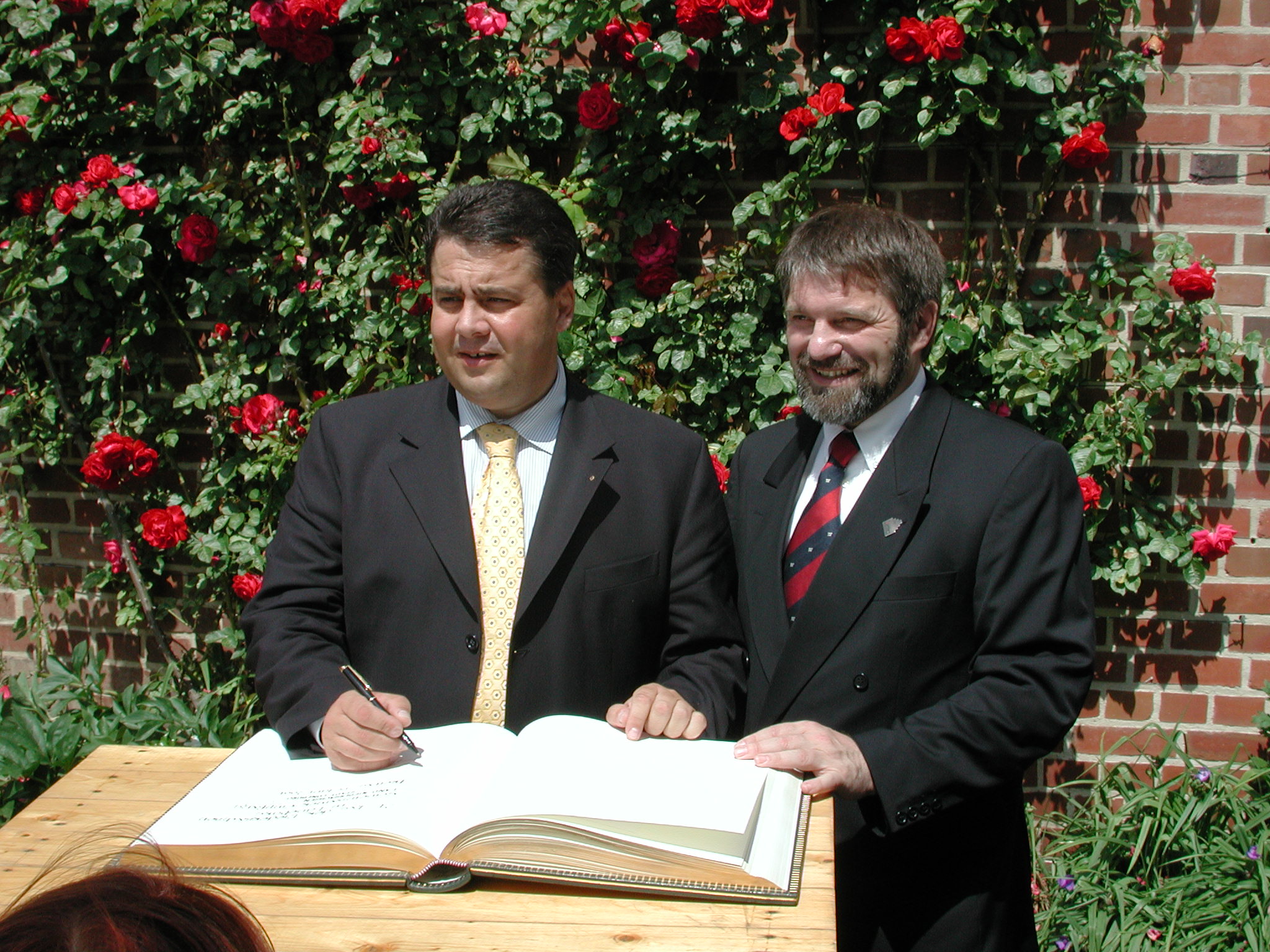 Der damalige Ministerpräsident Sigmar Gabriel trägt sich ins Goldene Buch der Stadt ein. Gabriel hielt jetzt auch bei einer internen Abschiedsfeier von Mädge eine Rede. (Foto: jj)