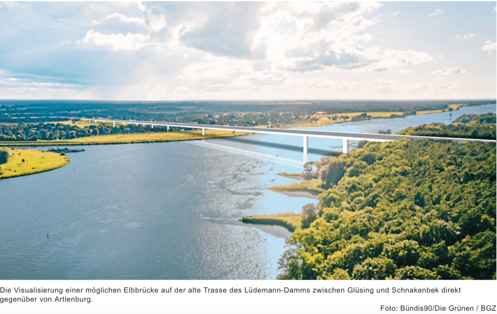 „Die Verwaltung des Landkreises Lüchow-Dannenberg prüft zurzeit, ob die Untersagung weiterer Planungen und des Baus der Brücke wegen Vertragsverstoßes (Trassenführung als Ortsdurchfahrt)