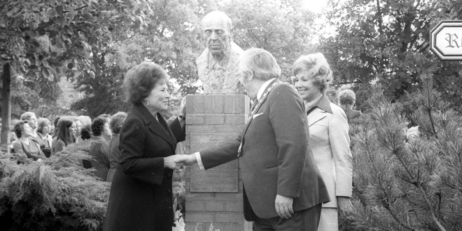 Ein neuer Handschlag zwischen Kunst und Kommerz wäre nötig. (Als Ehrung für den im Juni verstorbenen „Walzerkönig“ und Operettenkomponisten Robert Stolz wurde im September 1975 dessen Büste enthüllt. Mit Oberbürgermeister Alfred Trebchen auf dem frisch benannten „Robert-Stolz-Platz“ vor dem Theater Lüneburg waren seine Witwe Yvonne Louise „Einzi“ Stolz und die Opernsängerin Anneliese Rothenberger, rechts, zugegen. – Foto: LZ-Legende Josef Makovec)