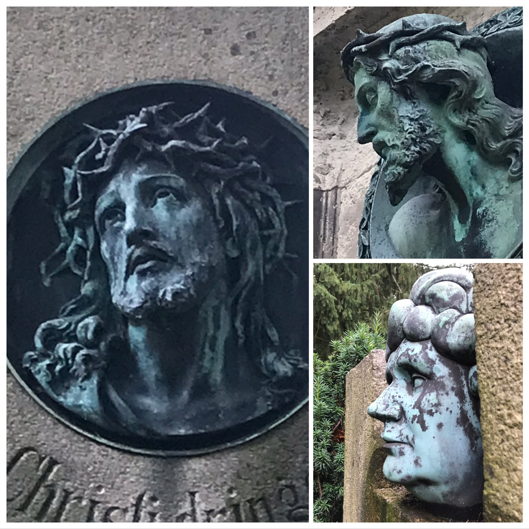 Die berühmte Opernsängerin Charlotte Huhn, von der Stadt geehrt auf dem Michaelisfriedhof, schaut auf das Relief der Grabstätte der großen Familie Frederich und das Relief in einem Grabmal eines Pastoren.