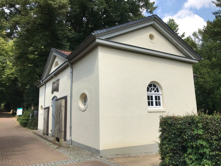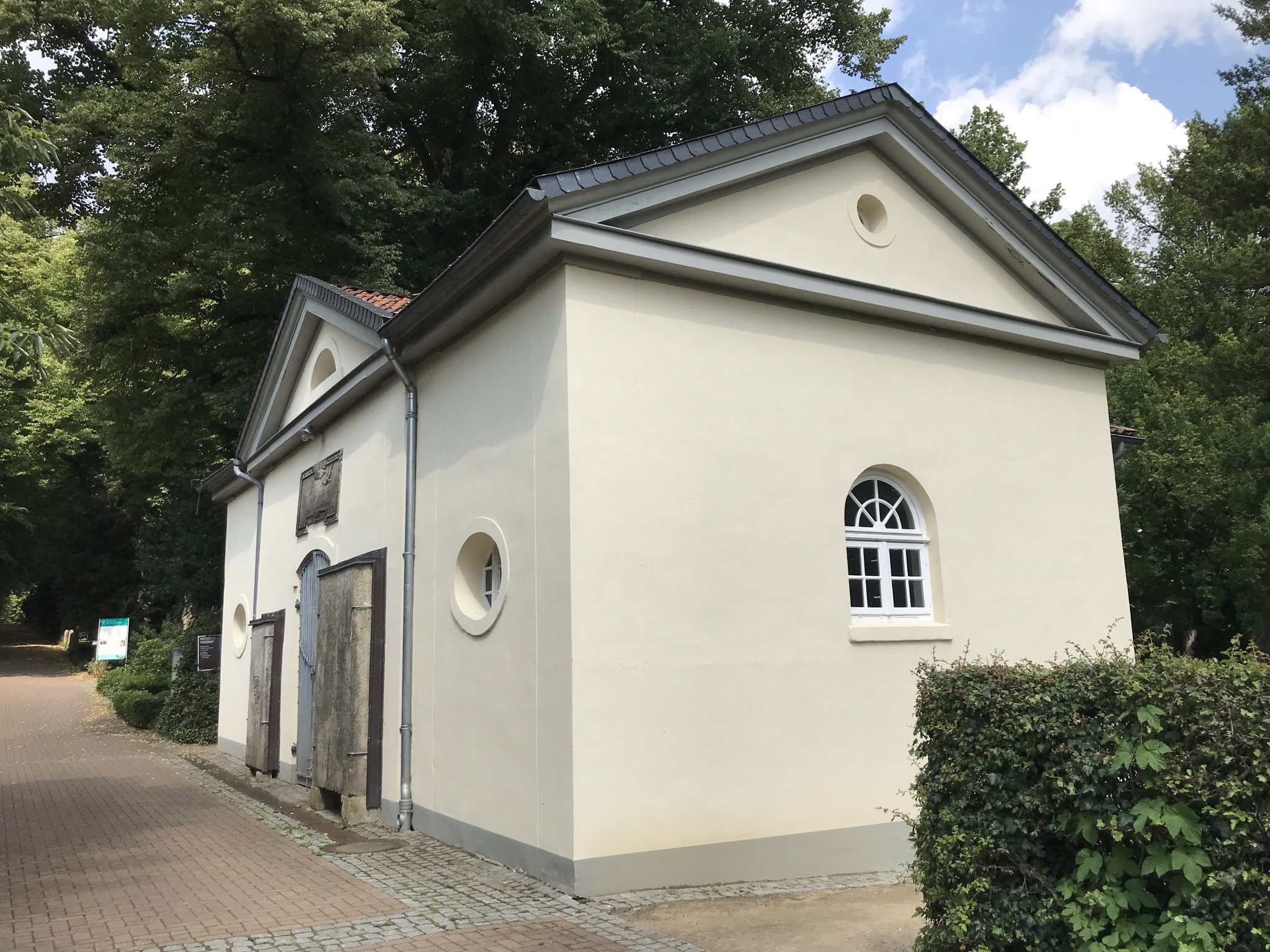 Die klassizistische Kapelle am Eingang des Friedhofs, Schinkel würde sich bei soviel Schlichtheit freuen.