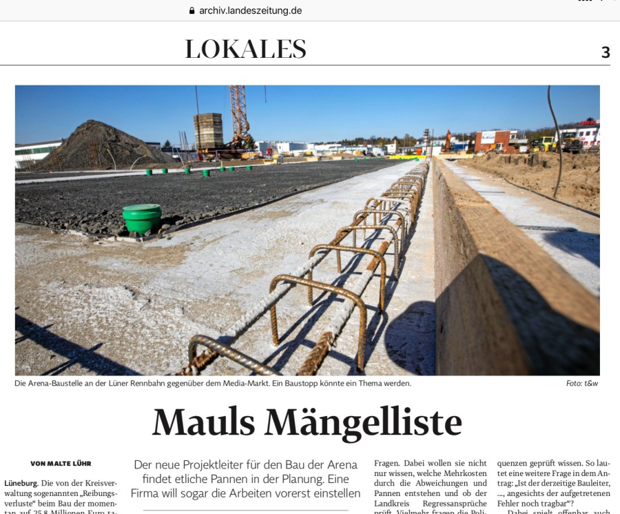 Ausschnitt Arena-Artikel vom 17. April aus der LZ, der neue Projektleiter Maul hatte schon kurz nach seiner Ernennung viele Mänge geortet.