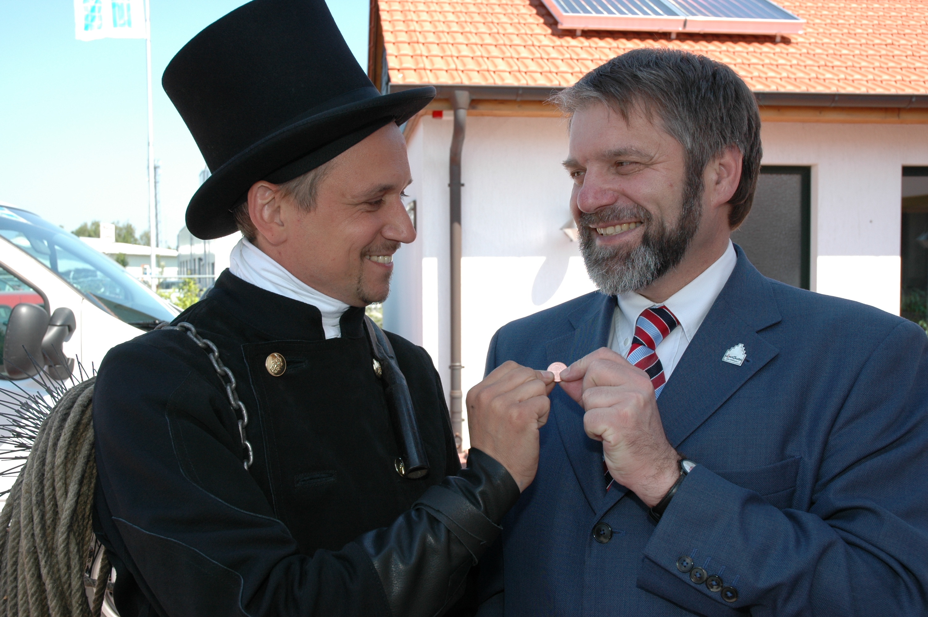 Schornsteinfegermeister Dirk Brinkmann schenkt Mädge einen Glückspfennig. (Foto: jj)
