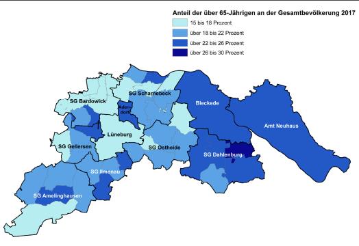 Die Grafik zeigt, im Amt Neuhaus und Bleckede nimmt der Anteil der über 65-Jährigen stark zu. Grafik: GEWOS/Landkreis Lüneburg