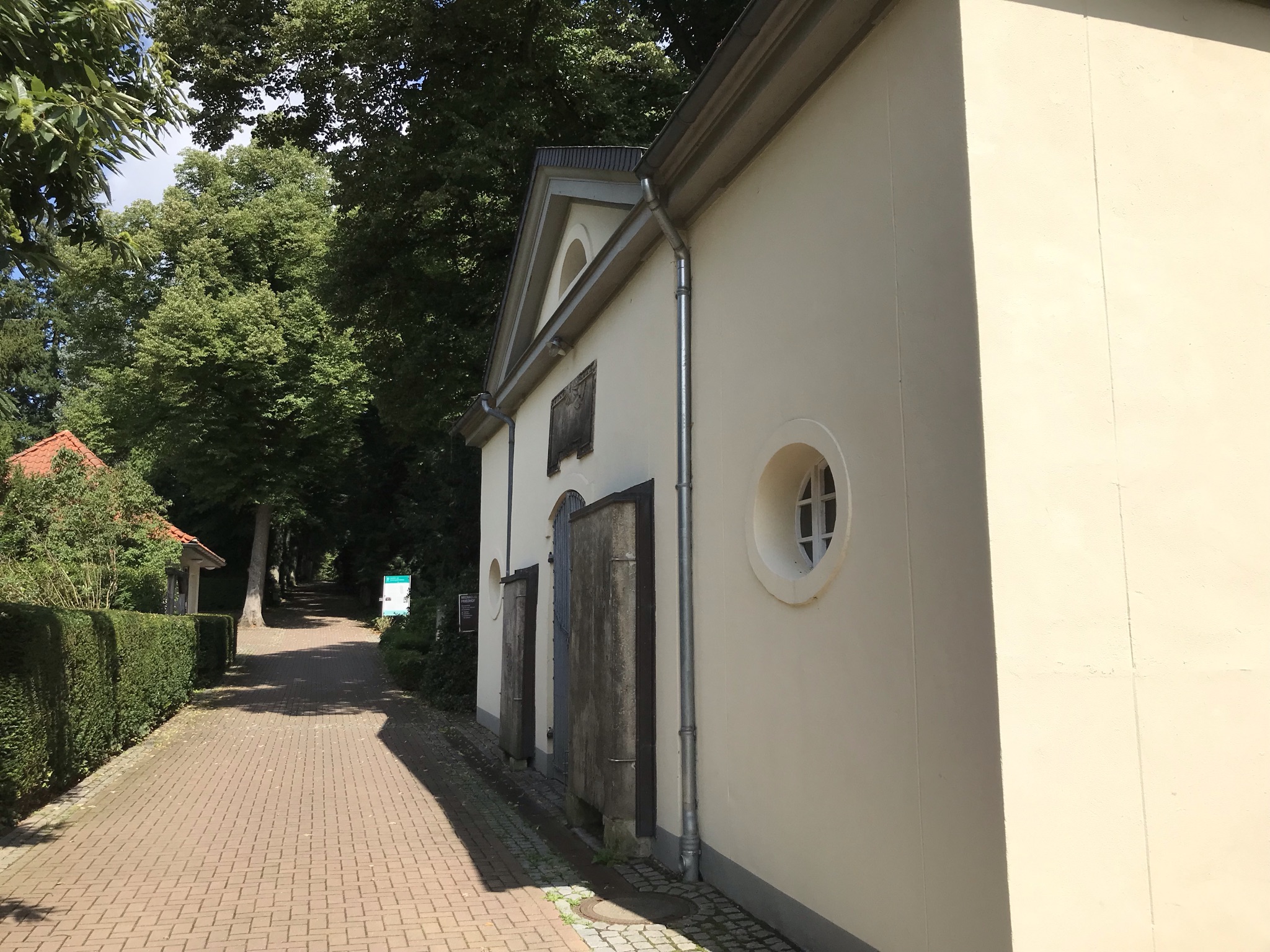 Die klassizistische Kapelle am Eingang des Friedhofs, Schinkel würde sich bei soviel Schlichtheit freuen.