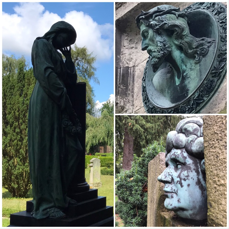 Oben rechts ein Relief auf der Grabstätte Frederich, darunter die Opernsängerin Charlotte Huhn.