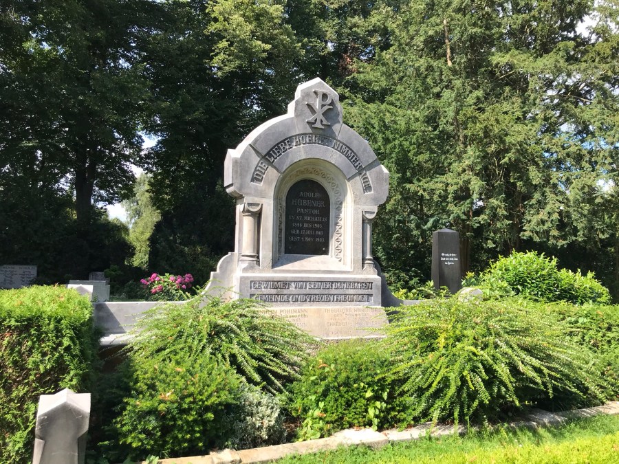 Das Grabmal für Pastor Hübner, in Dankbarkeit zu wilhelminischer Zeit aufgestellt, fällt wilhelminisch groß aus.