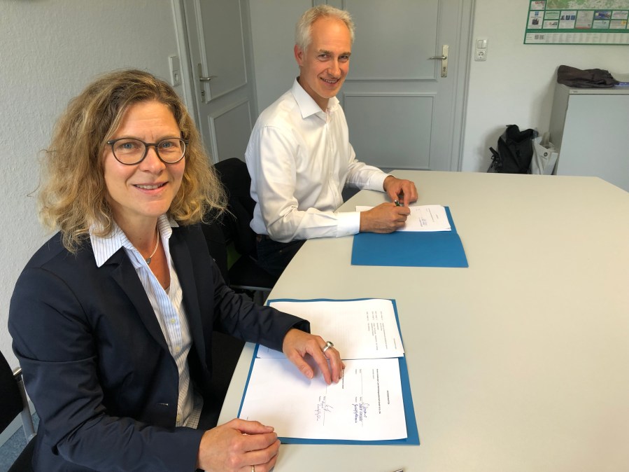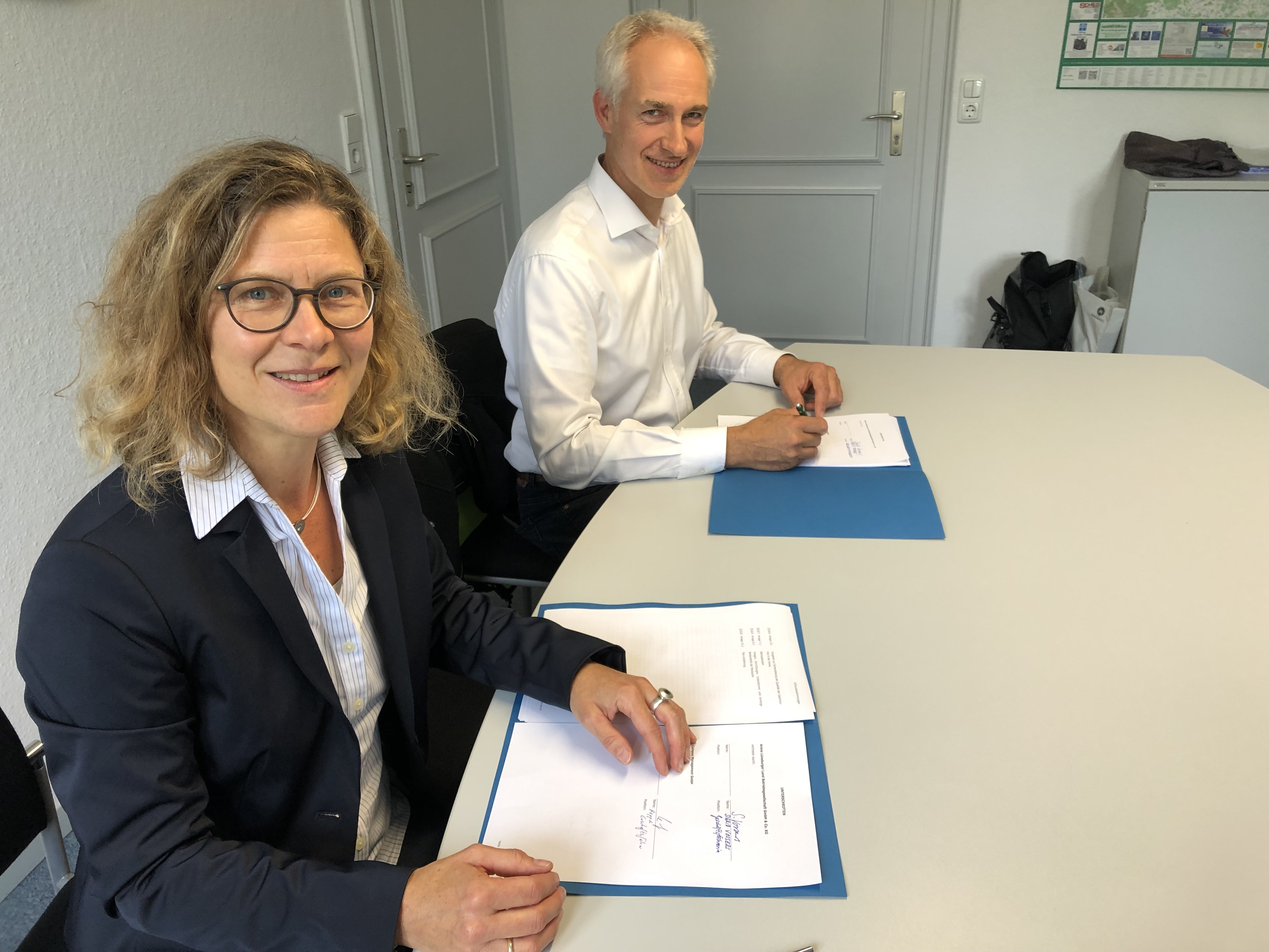 Kreisrätin und Arena-Chefin Sigried Vossers und Campus-Management-Geschäftsführer Klaus Hoppe besiegeln den Gastro-Vertrag für die Arena. Foto: Landkreis Lüneburg