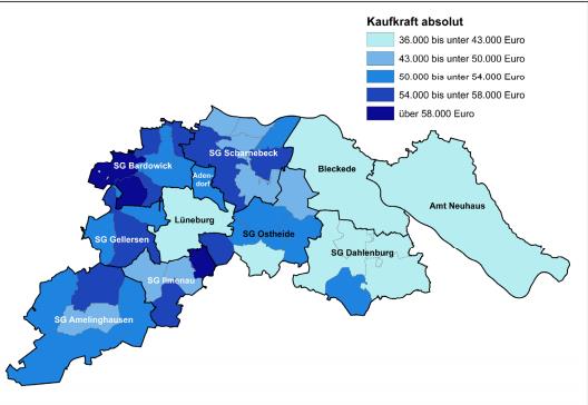 Bei der Kaufkraft im Landkreis Lüneburg gibt es ein deutliches West-Ost-Gefälle. Grafik: GEWOS/Landkreis Lüneburg