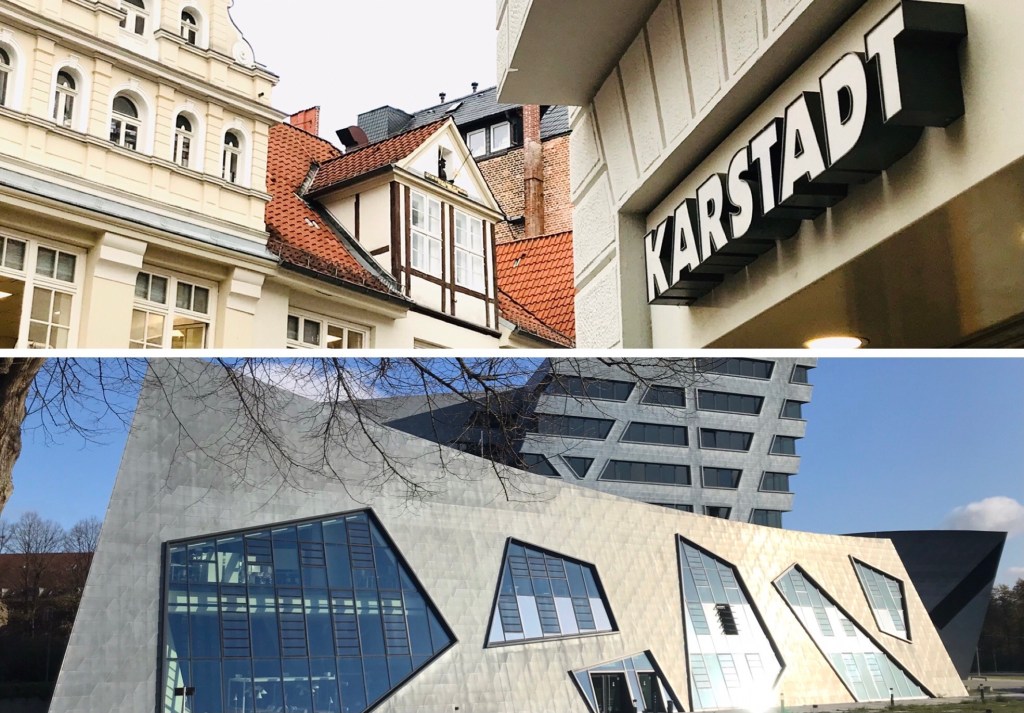 Zwei Symbole für den Wandel in Lüneburg: Das Kaufhaus Karstadt ist in schwerer See, weil das Prinzip nicht mehr verfängt. Die Uni mit dem Libeskind-Bau ist Zukunft, aber sie ist noch nicht in der Mitte von Lüneburg angekommen, (Fotos: jj)